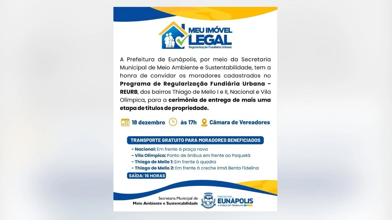 Prefeitura de Eunápolis vai entregar mais 200 títulos da REURB em 18 de dezembro